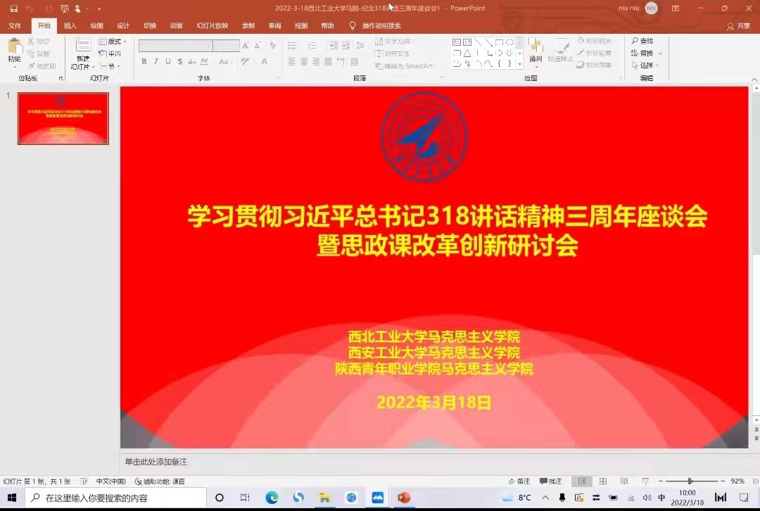 3月18日,学习贯彻习近平总书记318讲话精神三周年座谈会暨思政课改革创新研讨会在腾讯会议上召开,公司云顶国际vip.888与云顶国际vip.888、陕西青年职业公司云顶国际vip.888专家和教师参加这次盛会。西工大丁社教教授、高旭红教授,公司马院经理助理孟文科副教授、德法教研部主任冯婷副教授,陕西青年职业公司马院马雅玲经理等,从不同方面介绍了本校在3.18讲话精神指引下,对思政课程改革与创新的思路与成果。与会专家和教师给予充分肯定,并进行了深入研讨交流。