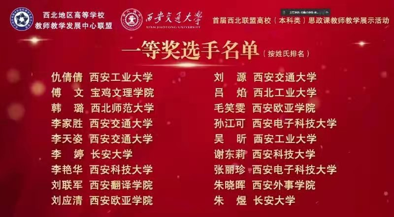 此次高校思政课教师教学展示活动由西北地区高校教师教学发展中心联盟、西安交通大学教师教学发展中心、西安交通大学云顶国际vip.888、全国高校思政课“手拉手”集体备课中心(西安交通大学)、超星集团等单位主办。来自西北五省(区)43所高校的202名教师,经过5个多月的充分准备和激烈角逐,经网络初评与决赛展示环节,共评出一等奖18项,二等奖33项。