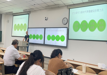 杨灏做了题为《自律是新时代师德师风建设的着力点》的专题党课。杨灏从他律与自律的辩证关系出发,指出全体教师应进一步加强对教师职业特性的充分认识,做到以德立身、以德立学、以德施教和相互成就。从明大德、守公德、严私德三个方面谈“立德”的外延。以成为“大先生”为目标,做“经师”和“人师” 的统一者。涵养高尚师德需厚植家国情怀,不断锤炼培养堪当民族复兴重任时代新人的责任担当。教师需不断提高学识学问,开展教研工作不能脱离课堂、员工,要积极开展社会实践,以广博的知识提升教学效果。切实担负起教书育人的神圣职责,不断用真理的力量武装激励人、培养人和成就人。
