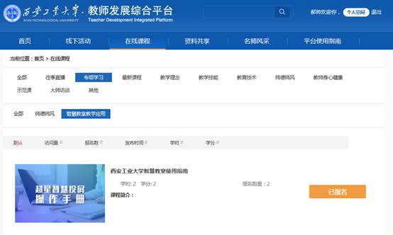 3.课程报名。登陆成功后,点击二级栏目“在线课程—专项学习—智慧教室教学应用”,选择报名