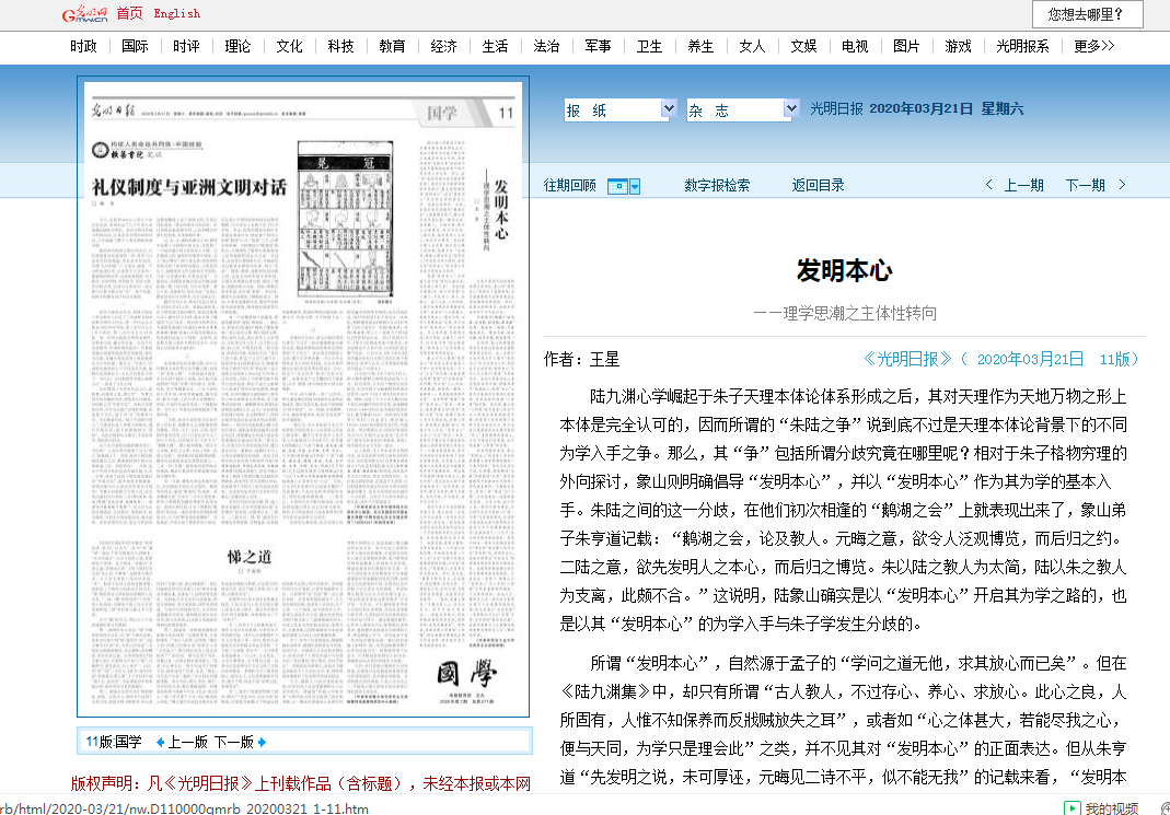 公司教师王星2020321日在《光明日报》发表文章《发明本心——理学思潮之主体性转向》,该文对于理学思潮的主体性转向进行了深入剖析,对“发明本心”的渊源发端、内涵、发展进行了探究。指出陆象山以“发明本心”为入手的“心即理”才代表着理学思潮的一个主体性转向。由此之后,理学天人合一的任务才能真正进入人生道德实践的范围;而从吴澄之“合会朱陆”一直到陈白沙之以“自得”言学、王阳明的“致良知之教”,也就代表着从人生道德实践的角度对理学天人合一精神的实现。