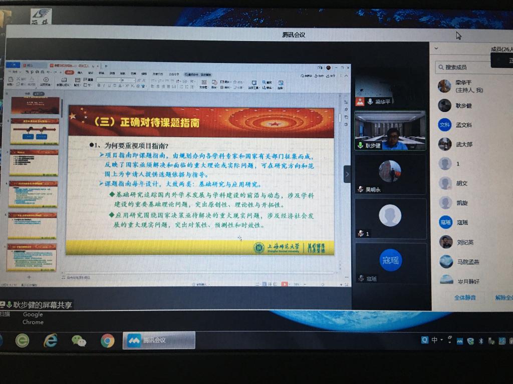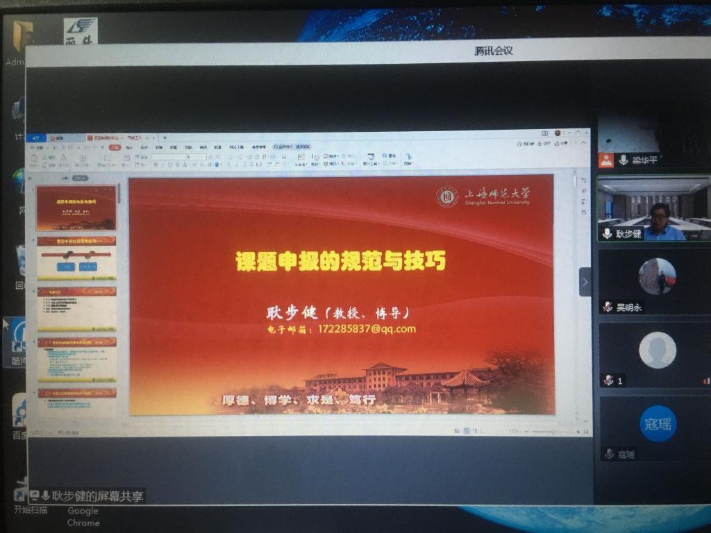 2020年12月10日,云顶国际vip.888邀请上海师范大学云顶国际vip.888副经理耿步健教授为全体老师做了题为“课题申报的规范与技巧”的讲座。耿步健教授兼任国家社科基金项目评审专家,教育部学位中心评审专家等职务,具有丰富的基金申报经验。耿教授从国家社科基金项目的申报类别入手,围绕国基金申报书的各部分内容,结合个人撰写经验和评阅经验,系统翔实的解析了每一部分的撰写技巧和注意事项,重点突出,启发性强。