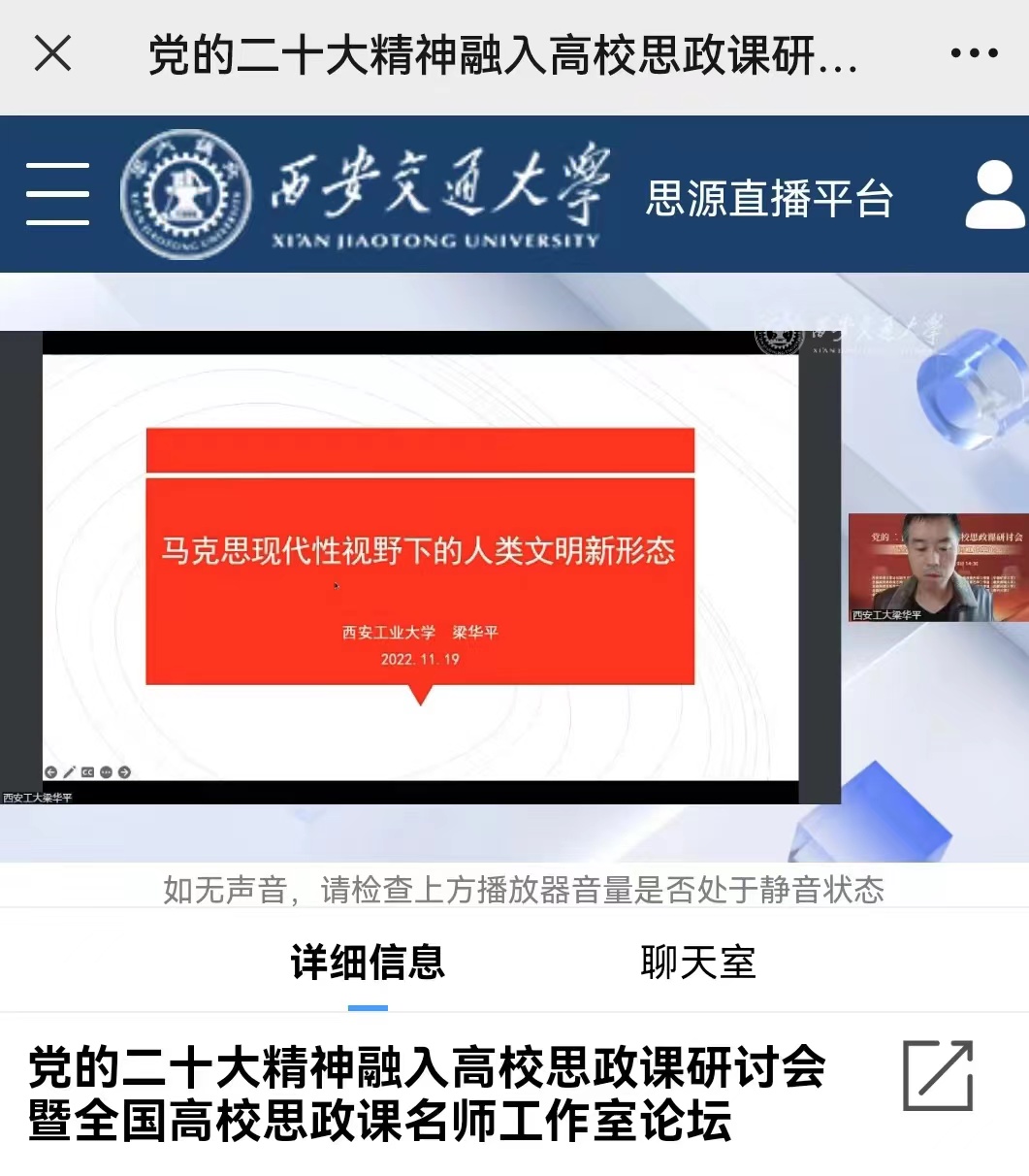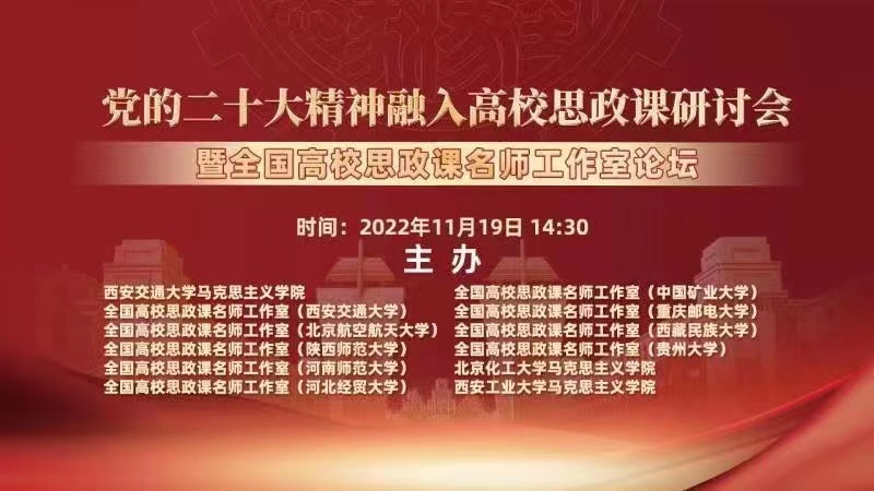 2022年11月19日,由公司与西安交通大学云顶国际vip.888、全国高校思政课名师工作室(西安交通大学等)共同主办的党的二十大精神融入高校思政课研讨会暨全国高校思政课名师工作室论坛成功举办。来自西安交通大学、北京航空航天大学、北京化工大学、陕西师范大学、河南师范大学、云顶国际vip8866、河北经贸大学、中国矿业大学、重庆邮电大学、西藏民族大学、贵州大学等11所高校的12位专家学者做了精彩发言。本次研讨会通过腾讯会议和交大思源直播平台直播,来自全国各地超过8000余名师生在线参加会议或收看直播。