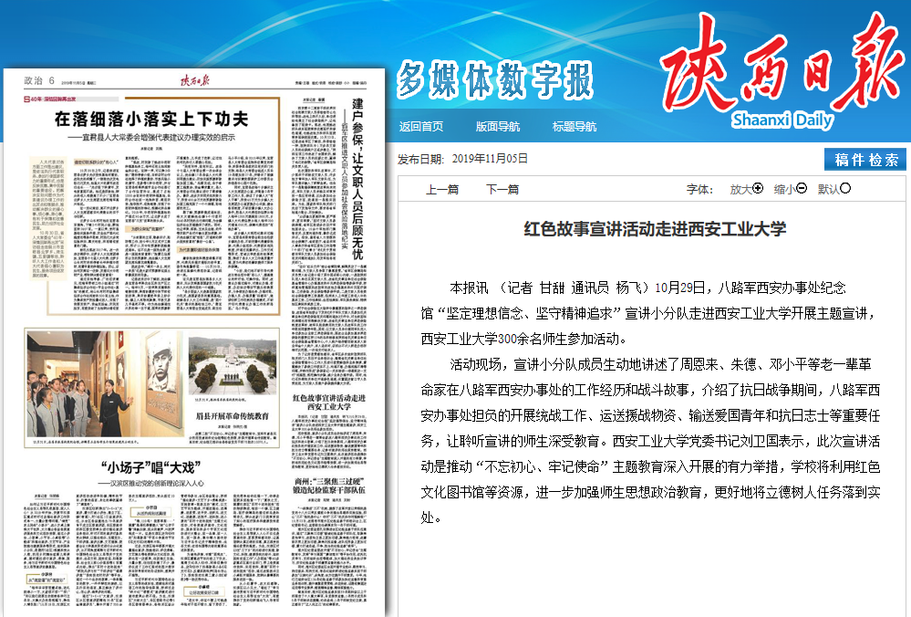 陕西日报2019年11月5日第6版以“红色故事宣讲活动走进云顶国际vip8866”为题,报导公司邀请八路军西安办事处纪念馆来公司思政课堂开展优秀历史文化进校园宣讲活动。
