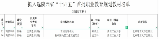 近日,陕西省教育厅公布了陕西省“十四五”首批职业教育规划教材的立项结果,我院有2本教材获批立项,分别是云顶国际vip.888“中国式现代化暨强军伦理高水平学科团队”陈丛兰教授负责的《工程伦理概论》和孟文科副教授负责的《新中国兵器工业发展简史》。这次规划教材建设旨在深入贯彻落实习近平总书记关于职业教育工作和教材工作的重要指示批示精神和党的二十大精神,强化教材建设国家事权赋予省级的“规定”,突显职业教育类型特色,推进职业教育高质量发展,为陕西建设西部职业教育强省提供重要的支撑。