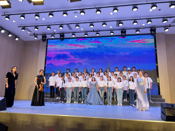 公司合唱队由来自研一、研二的35位同学与公司10名老师组成,以《东方之珠——军港之夜》串烧的方式演绎香港回归水兵归家的故事。沈华同学担任总策划与串讲人,杨崇同学重新整合编曲,李欣然同学进行小提琴演奏,李宏晓茜同学伴舞,与合唱团的其他成员一起,为观众们带来了一场视听盛宴。
