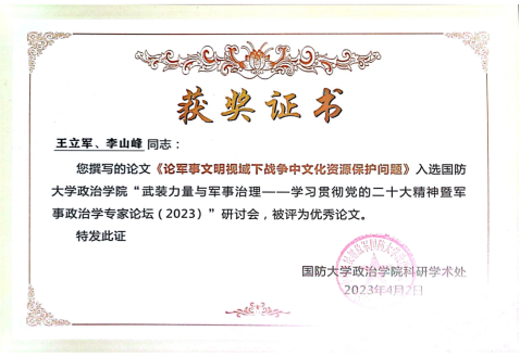 王立军副教授做了题为《论军事文明视域下战争中文化资源保护问题》的报告,受到与会专家学者的高度关注,并荣获此次会议的优秀论文奖。